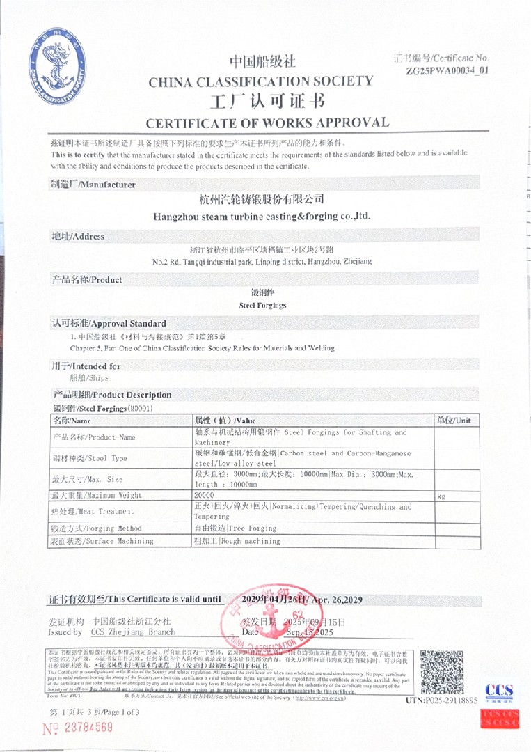 中国船级社锻钢件认证书